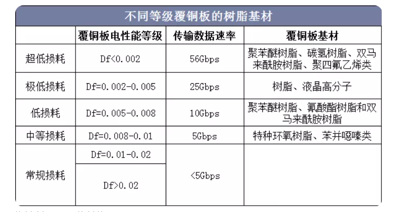 根據(jù)介電損耗等級,覆銅板可分為六個等級,不同等級所用的樹脂有所不同。普通環(huán)氧樹脂傳輸損耗較大,是傳統(tǒng)覆銅板的主要基材;改性特種環(huán)氧樹脂的Dk和Df值無法達到PTFE、PCH、LCP等特種樹脂的水平,只能作為中等損耗等級的高頻高速覆銅板基材(Df=0.008-0.01),而極低/超低損耗高頻高速覆銅板所用的特種樹脂性能要求最高,通常使用PTFE、BMI、PPE等特種樹脂。