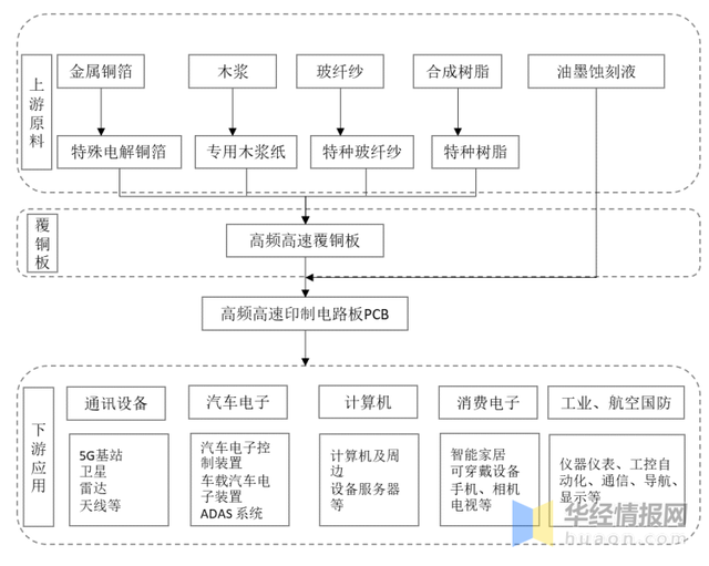 高頻高速覆銅板行業(yè)產(chǎn)業(yè)鏈上游為原材料,包括金屬銅箔、木漿、玻纖紗、合成樹脂和油墨刻蝕液;下游為各類電子產(chǎn)品,包括消費電子、汽車電子、計算機、通訊設(shè)備和工業(yè)、航空國防。