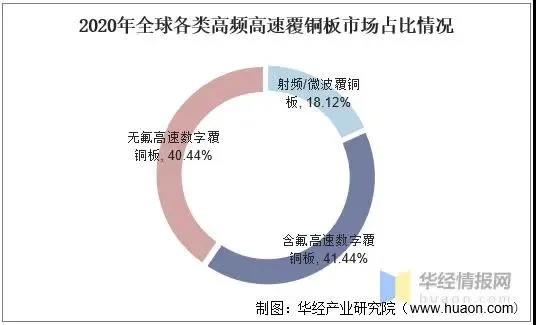 2020年全球高頻高速覆銅板市場為28.86億美元,同比增長17.03%,其中,射頻/微波覆銅板2020年銷售額為5.23億美元,預(yù)計2024年產(chǎn)值達到8.53億美元;高速覆銅板中,含氟高速覆銅板2020年銷售額為11.96億美元,無氟高速覆銅板2020年銷售額為11.67億美元,同比增長32.86%,增速最快,預(yù)計2024年高速覆銅板總產(chǎn)值28.3億元。