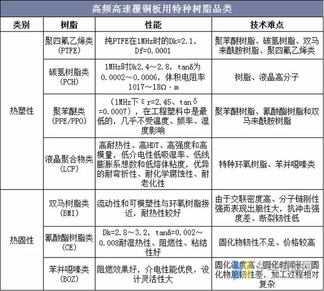 按照性能分類,高頻高速覆銅板用特種樹脂可分為熱塑性樹脂和熱固型樹脂,前者受熱后能發(fā)生流動變形,如聚四氟乙烯(PTFE)類樹脂,碳氫樹脂(PCH)類、聚苯醚(PPE)、液晶聚合物(LCP)類等,另一類是熱固型樹脂,加熱時不能軟化和反復塑制,如雙馬來酰亞胺(BMI)類等。
